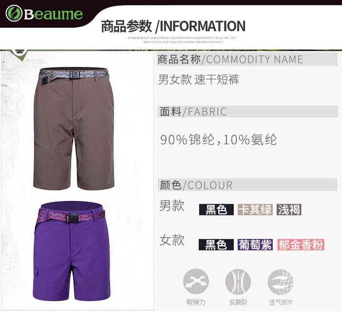 beaume户外男女速干短裤纯色多选舒适透气轻薄快干短裤春夏新款
